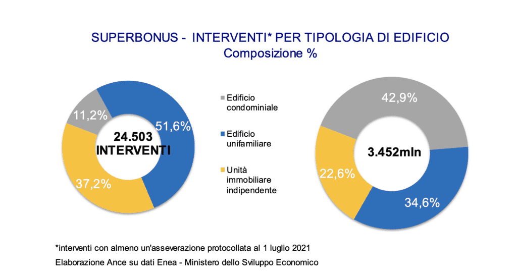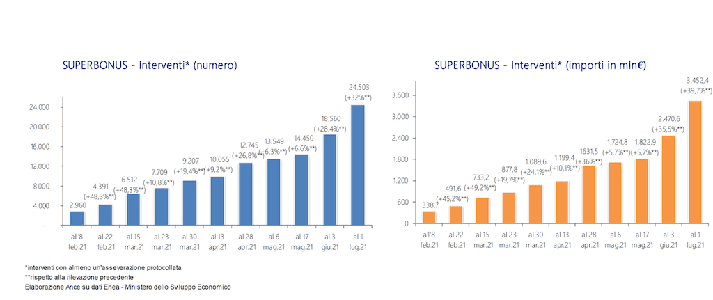 Anche il Superbonus 110% sta contribuendo a rilanciare la filiera edile e a raggiungere gli obiettivi di sicurezza sismica e di efficienza energetica. Secondo i dati Enea-Mise, al 1° luglio 2021, risultano 24.503 interventi legati al Superbonus per un valore di quasi 3,5 miliardi di euro. Un bel passo in avanti rispetto al monitoraggio di maggio con un aumento del +32% in termini di numero e del +39,7% nell’importo.