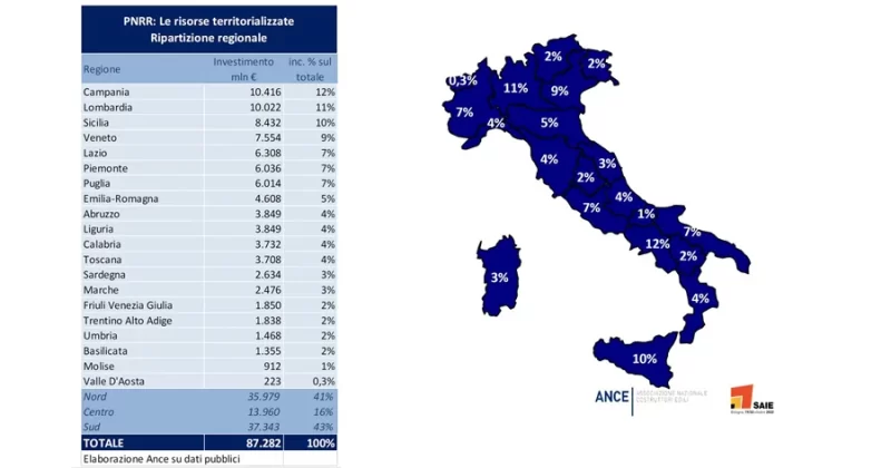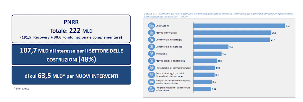 Ammontano, quindi, a 107,7 miliardi di euro gli investimenti che interessano il settore, di cui 63,5 miliardi destinati ai nuovi interventi; mentre Francia e Germania hanno destinato risorse pari al 21% e al 23% dei rispettivi piani. Nel periodo 2021-2026 si prevede poi che il PNRR possa determinare per il comparto costruzioni una crescita di 3,3 punti percentuali.